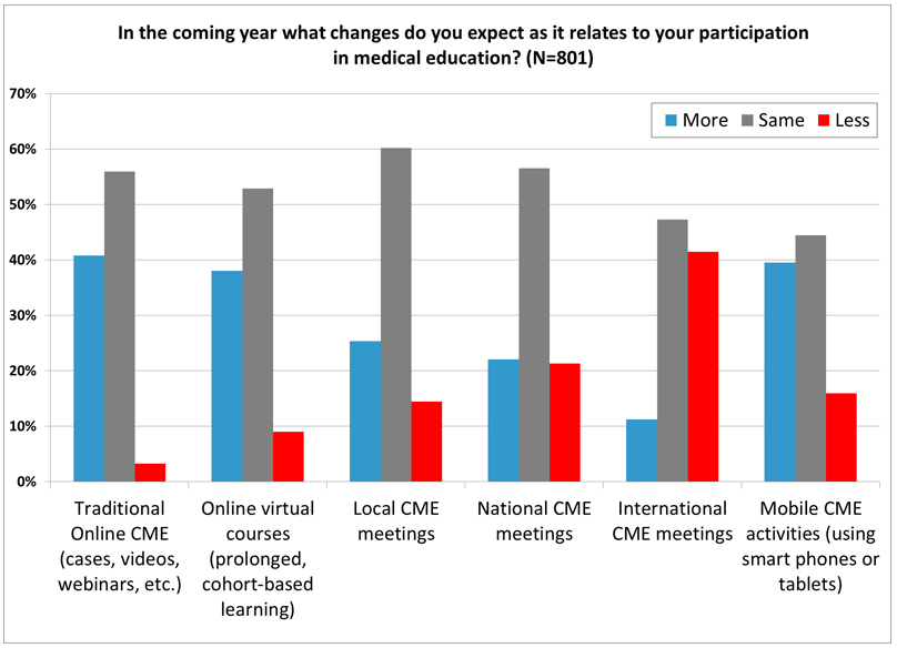 Data collected by AcademicCME and ArcheMedX, demonstrates that 97% of clinicians are planning to either increase or maintain their participation in online continuing education programs during the next year, while there appears to be a significant pull back in the participation in live meetings and conferences.